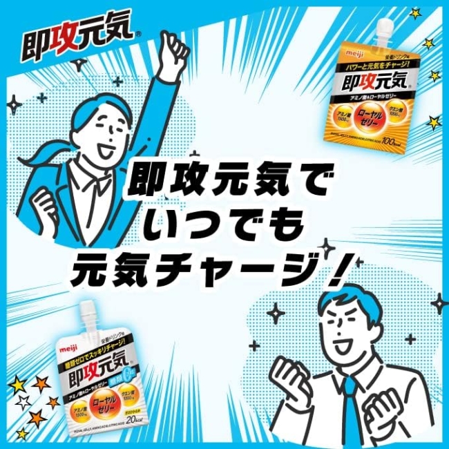 限界を感じた瞬間に即攻チャージ。明治の即攻元気ゼリーはアミノ酸とローヤルゼリーを贅沢に配合した糖類ゼロの救世主。栄養ドリンク味の爽快感が疲れを吹き飛ばす。忙しい毎日を支える180gの6個セットをあなたに。