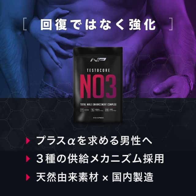 先端科学が導く男の頂点。テストコアNO3はテストフェンやサビートなど厳選5種の次世代成分を凝縮し、停滞した活力を劇的に再燃させる究極のサプリメントです。揺るぎない自信と圧倒的なパフォーマンスを今すぐその手に。