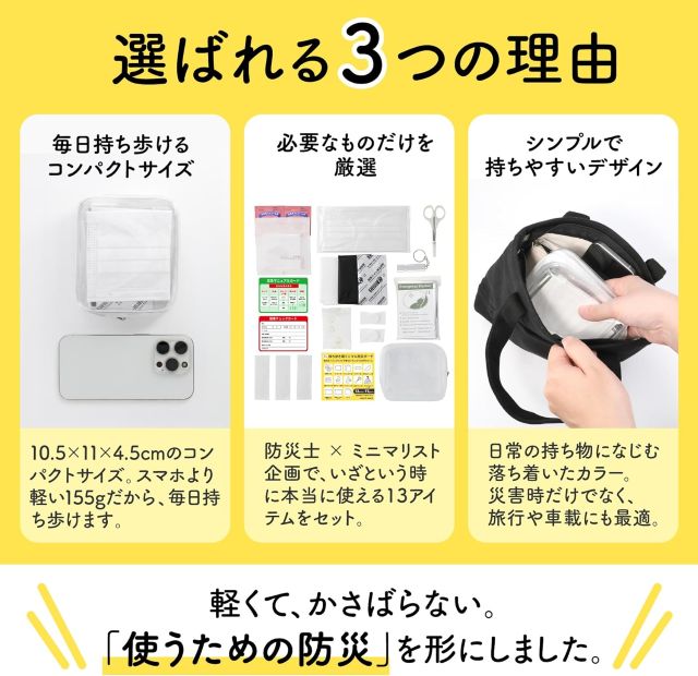 0より1の備えを、防災士とミニマリストが厳選した毎日持ち歩ける防災ポーチ、携帯用防災セットの決定版、通勤や通学に安心をプラスする応急処置グッズ、大切な人へのプレゼントにも最適な軽量で洗練された究極の逸品
